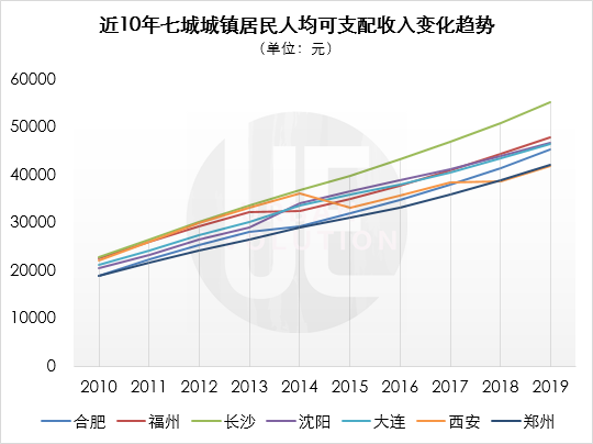 在此情形下,居民的購(gòu)買(mǎi)力將對(duì)城市消費(fèi)發(fā)展產(chǎn)生更大影響。比較過(guò)去十年的城鎮(zhèn)居民人均可支配收入,西安逐年落后,并最終從7市第二下降至末尾;相比之下,長(zhǎng)沙則連續(xù)多年保持領(lǐng)先地位。