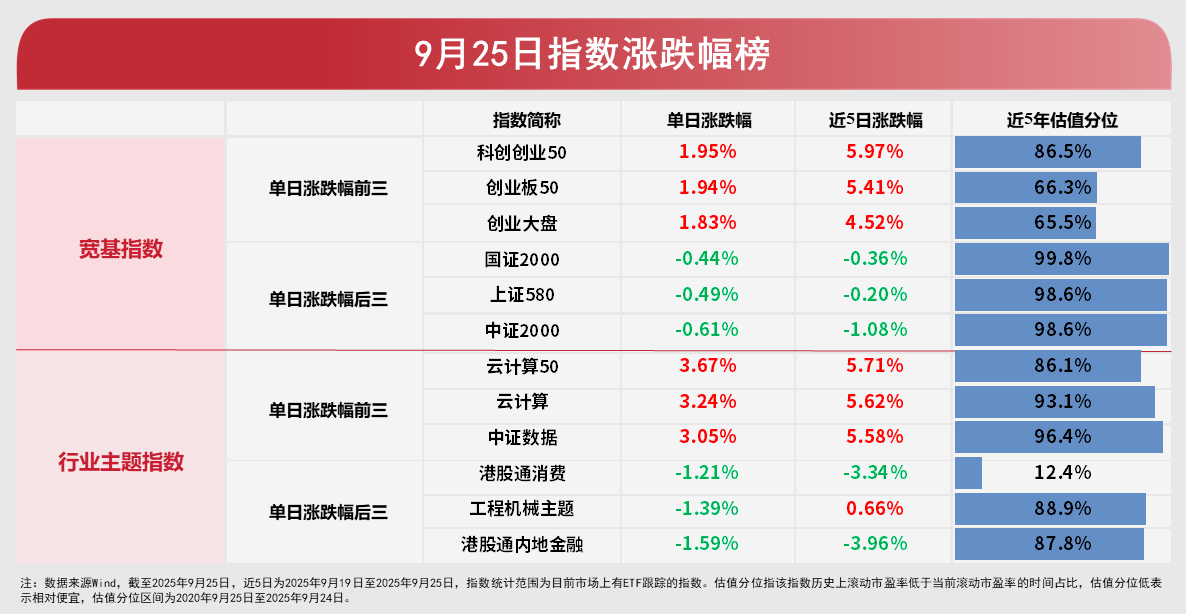 行業主題方面,云計算與人工智能產業鏈股集體走強,云計算ETF(516510)標的指數漲超3%,人工智能ETF(159819)標的指數上漲2.7%;港股消費、金融相關指數跌幅居前。
