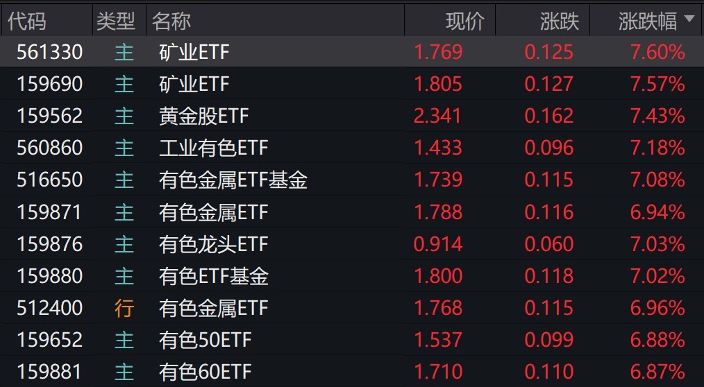 受盤面影響,礦業、有色相關ETF漲約7%。