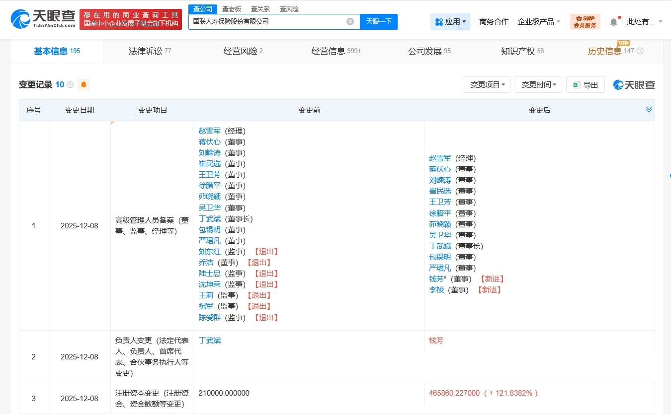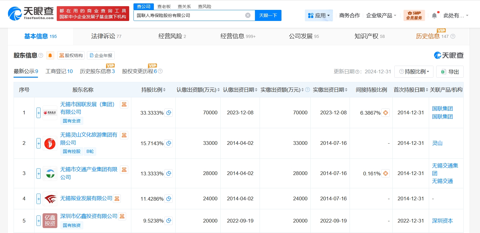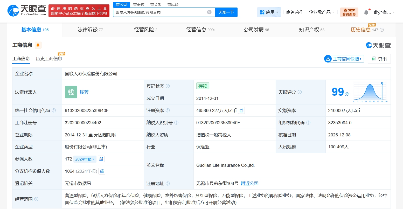 每經AI快訊,天眼查App顯示,近日,國聯人壽保險股份有限公司發生工商變更,注冊資本由21億元人民幣增至約46.6億元人民幣,增幅約122%,同時,法定代表人及多位高管發生變更。該公司成立于2014年12月,法定代表人為錢芳,經營范圍為人壽保險和年金保險,健康保險,意外傷害保險,分紅型保險,萬能型保險,上述業務的再保險業務,國家法律、法規允許的保險資金運用業務,經中國保監會批準的其他業務。股東信息顯示,該公司由無錫市國聯發展(集團)有限公司、無錫靈山文化旅游集團有限公司、無錫市交通產業集團有限公司等共同持股。