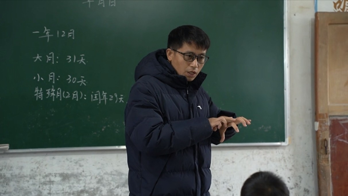 “上課!”“起立,老師好!”清晨的陽光透過窗戶,灑在石碑村小學三年級三班的教室里。全科教師劉濤正用“數拳頭記月份”的趣味教學法,帶領7名學生區分大小月,孩子們瞪著圓溜溜的眼睛,專注地跟著老師的動作比劃。教室后方的黑板報上,彩色畫筆勾勒的七色彩虹,讓簡陋的空間生氣十足。
