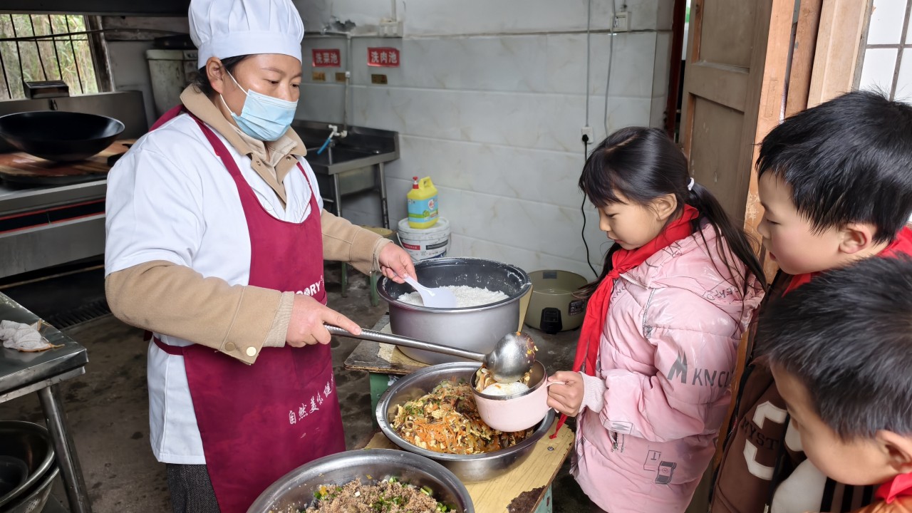 正午時分,來到午餐時間,孩子們排著隊下樓打飯。粉蒸肉、胡蘿卜炒雞蛋、素炒白蘿卜絲配上營養湯,冒著熱氣的飯菜端上桌,孩子們捧著飯盒吃得津津有味。“這些都是縣上統一配送的營養餐,每天食材新鮮現做,絕對保證孩子們的營養需求。”唐宗艷介紹,學校雖小,但孩子們的用餐保障從未打過折扣。