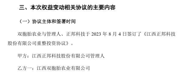 2023年12月15日,正邦科技收到江西省南昌市中級人民法院送達的《民事裁定書》,裁定確認正邦科技重整計劃執行完畢并終結上市公司重整程序。之后的12月27日,正邦科技控股股東變更為“雙胞胎”,公司實控人變更為鮑洪星、華濤、鮑華悅。