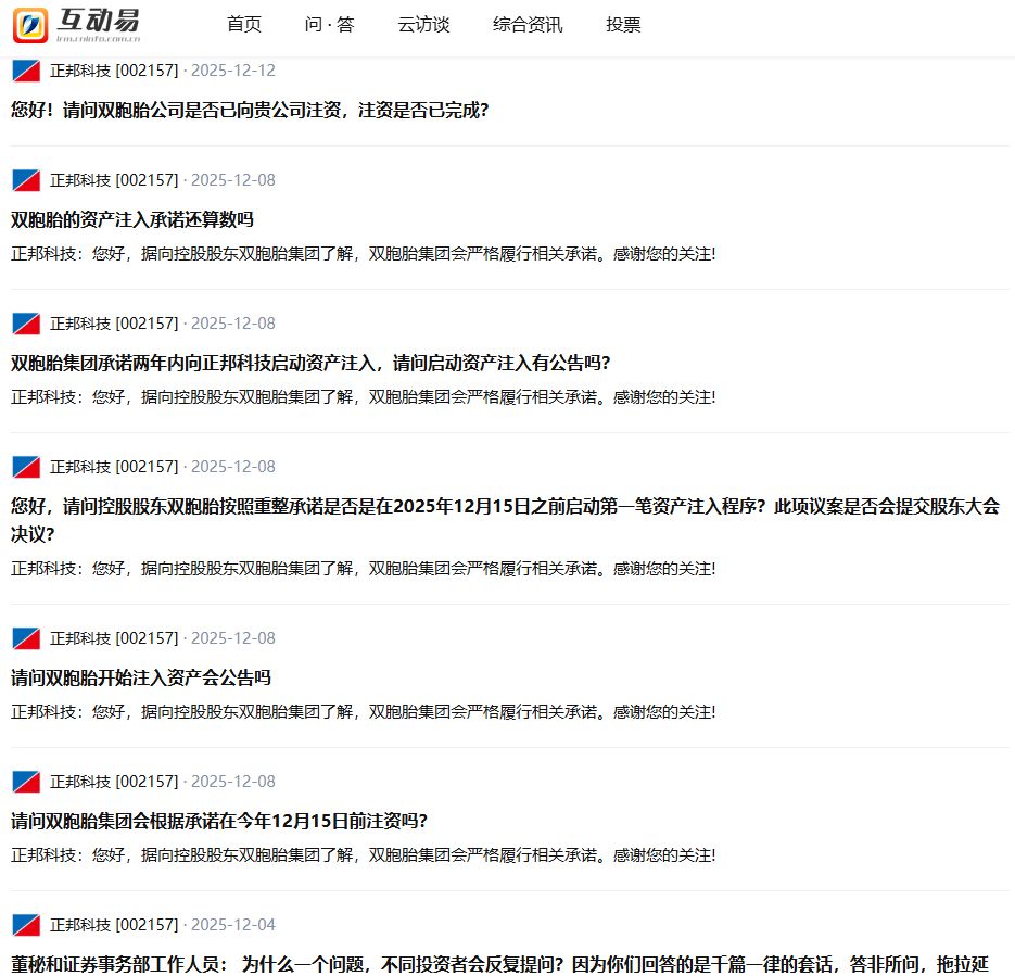 投資者對“雙胞胎”履行承諾一事也十分關心,多次在投資者互動平臺問及進展,甚至一天的四條問題都與此有關。正邦科技則表示,經向控股股東“雙胞胎”了解,“雙胞胎”會嚴格履行相關承諾。